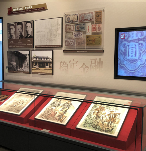 在介紹浙東銀行抗幣發(fā)行的內(nèi)容前,大家看到了在櫥窗里的三幅畫(huà),展現(xiàn)的是《浙東銀行成立》《抗幣印刷》《抗幣運(yùn)輸》,亦系作者張鐘接受市委黨史辦下達(dá)的任務(wù),于前幾年寫(xiě)實(shí)創(chuàng)作的浙東銀行系列作品之縮小件。